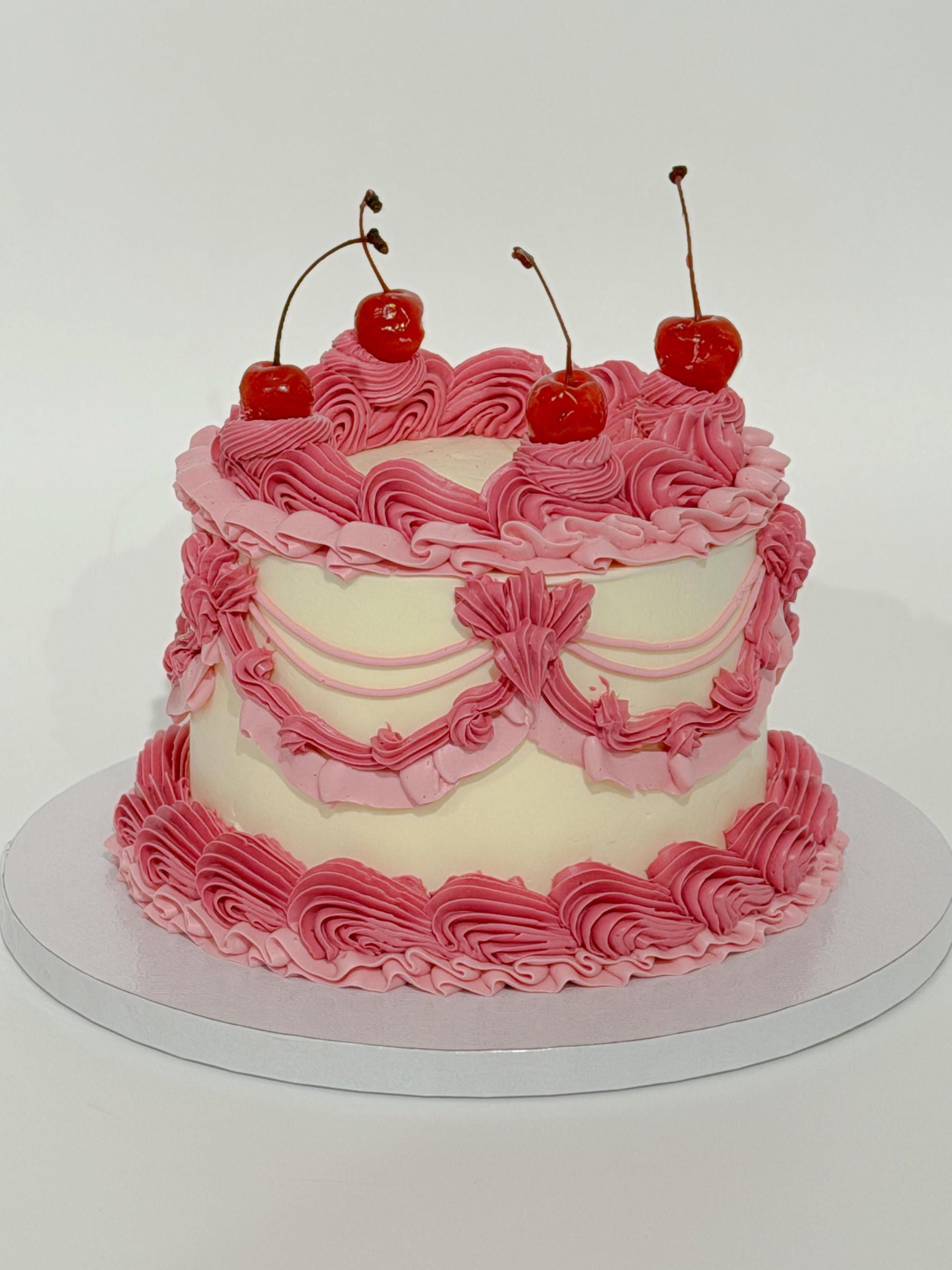 Pastel de inspiración vintage decorado artesanalmente con suaves volantes en tonos rosa y coronado con cerezas brillantes. Un diseño delicado y romántico que evoca la pastelería clásica europea, perfecto para celebraciones especiales donde la estética y el detalle lo son todo.