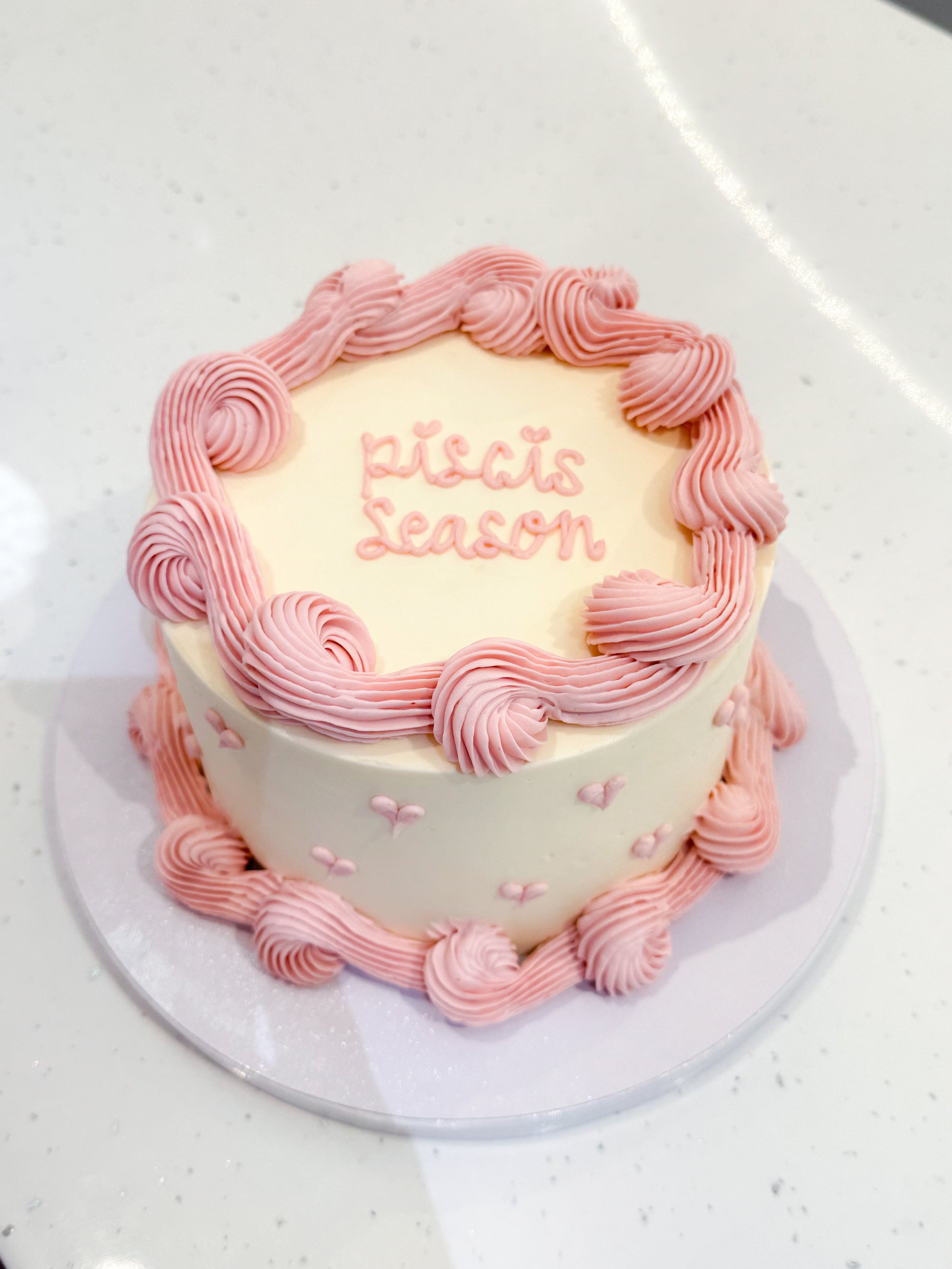 Un pastel sencillo y elegante. Personalízalo con tu color favorito. La base siempre será color blanco/beige. El color que elijas será de ese color los bordes y los corazones. Termina con un mensaje personalizado.