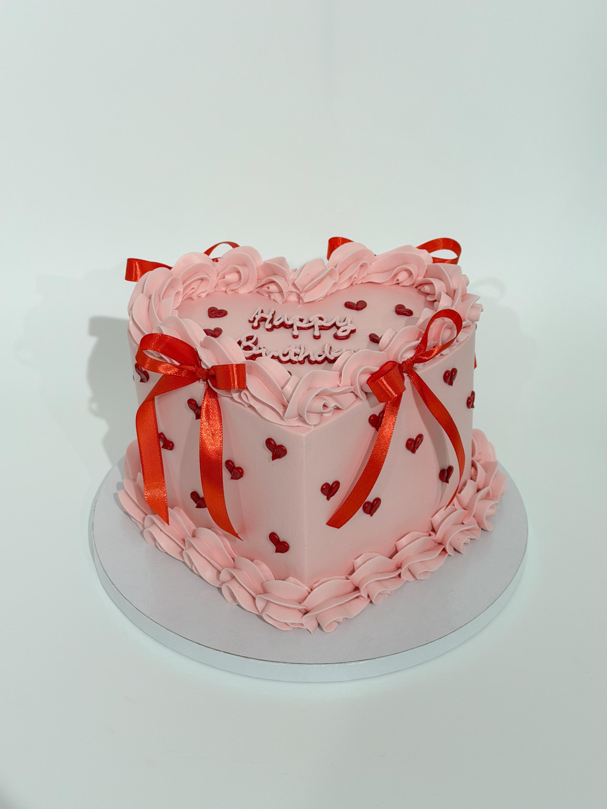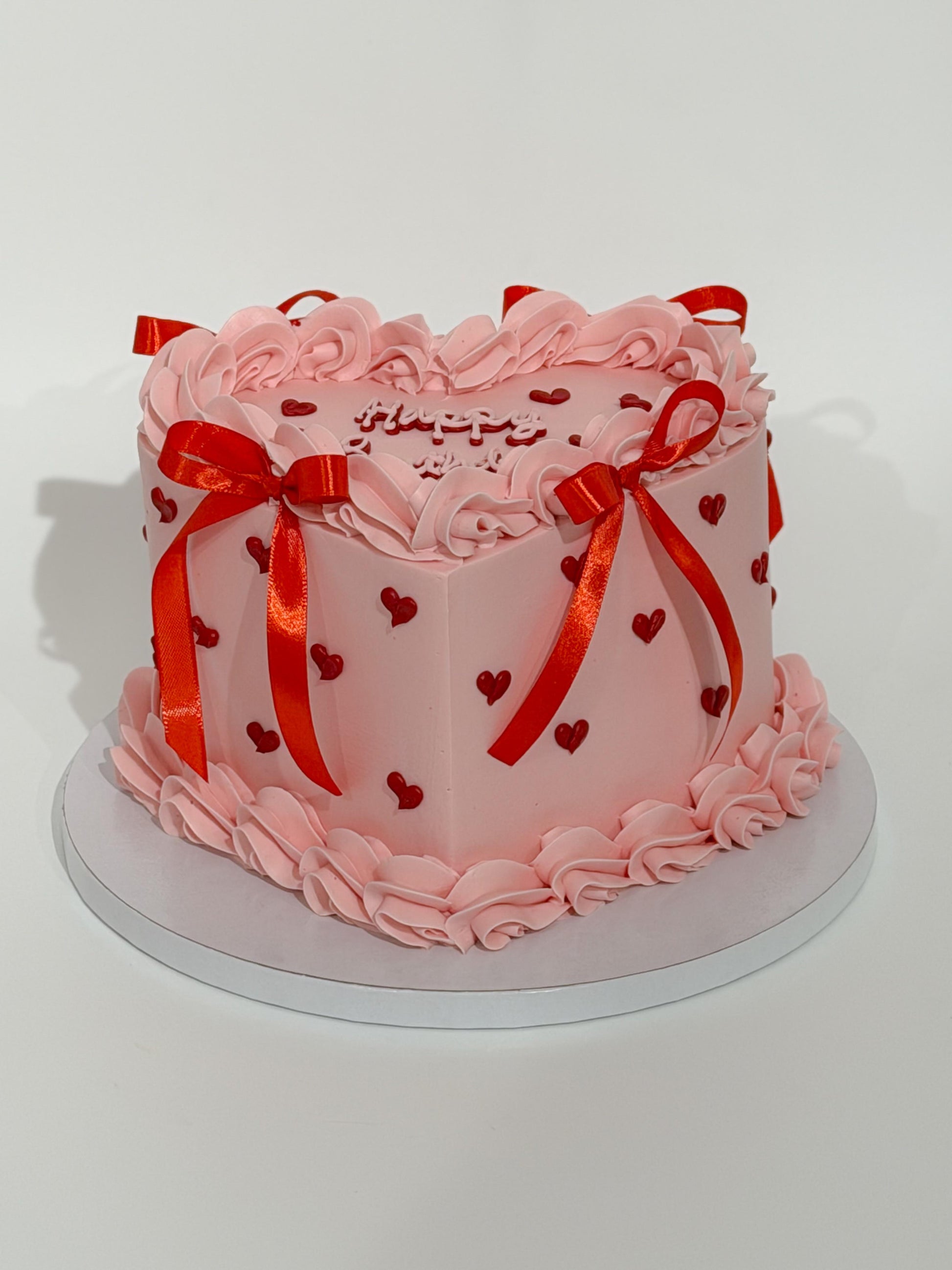 Pastel en forma de corazón con acabado artesanal en tonos rosa pastel, decorado con delicados corazones y lazos satinados que evocan amor y elegancia. Una creación pensada para celebrar momentos especiales con un diseño exclusivo, romántico y atemporal. Ideal para regalar, sorprender y compartir.