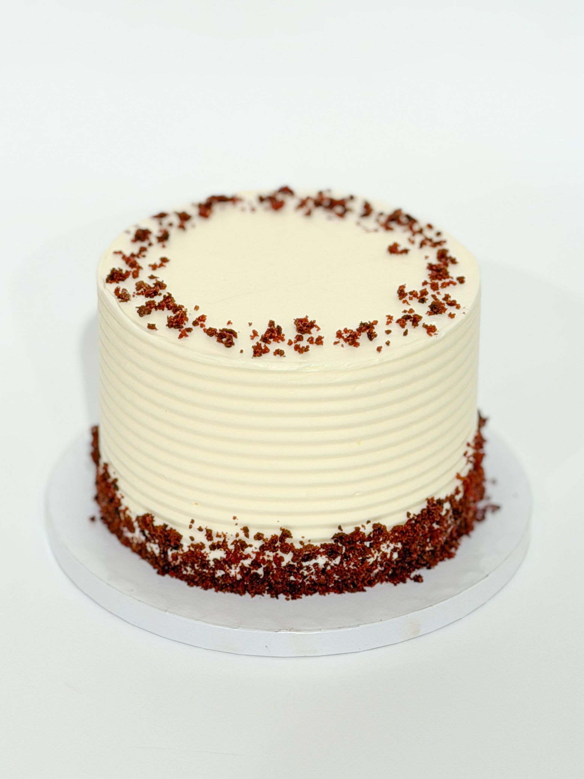Decorado con un acabado en líneas en tono color crema y migas de red velvet, tal como se muestra en la imagen.