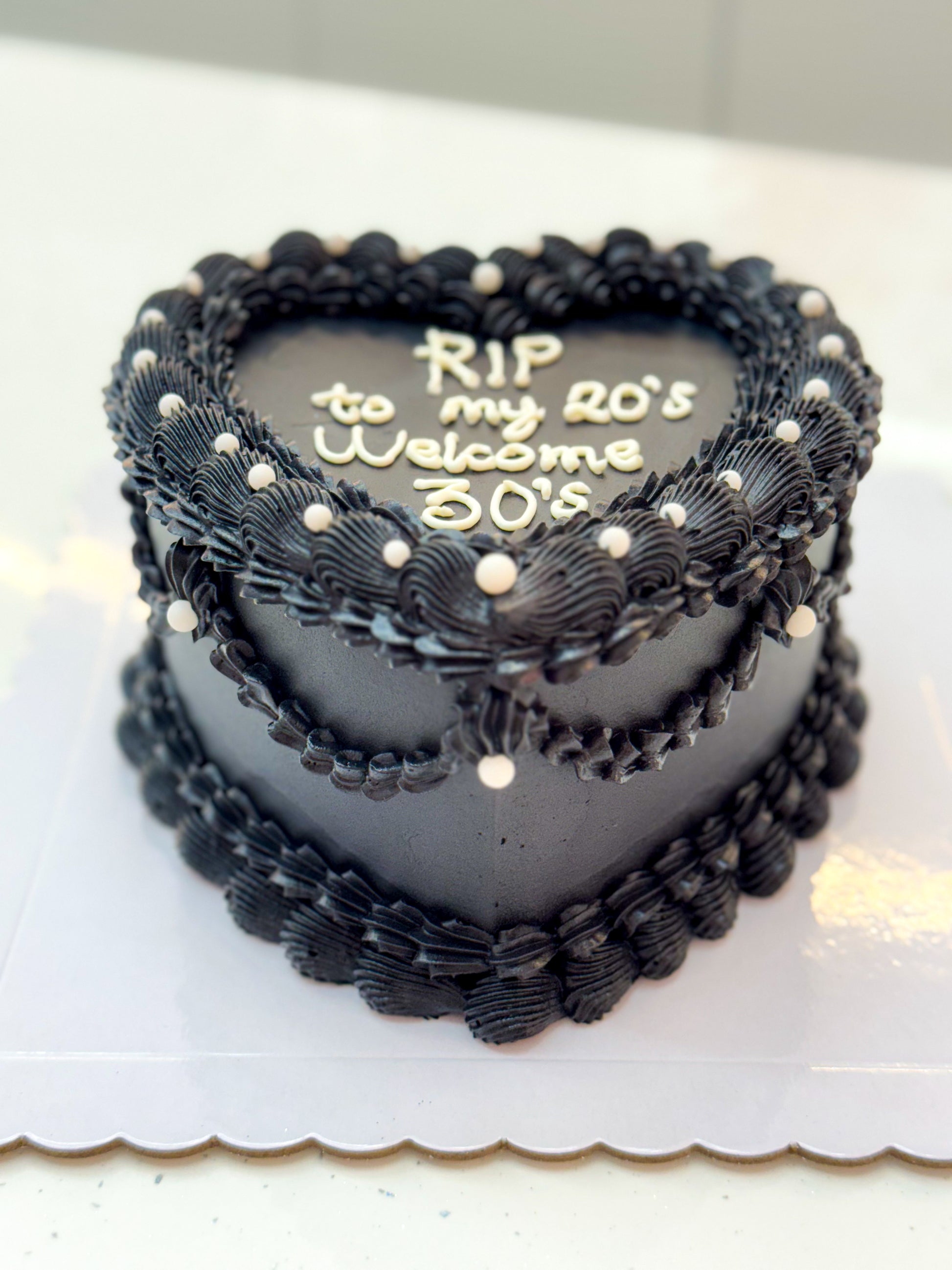 Un pastel de corazón vintage único color negro y perlas. Frase del pastel se mantiene ya que es la temática del RIP/WELCOME. Añade la edad para personalizarlo y elige tu sabor favorito.