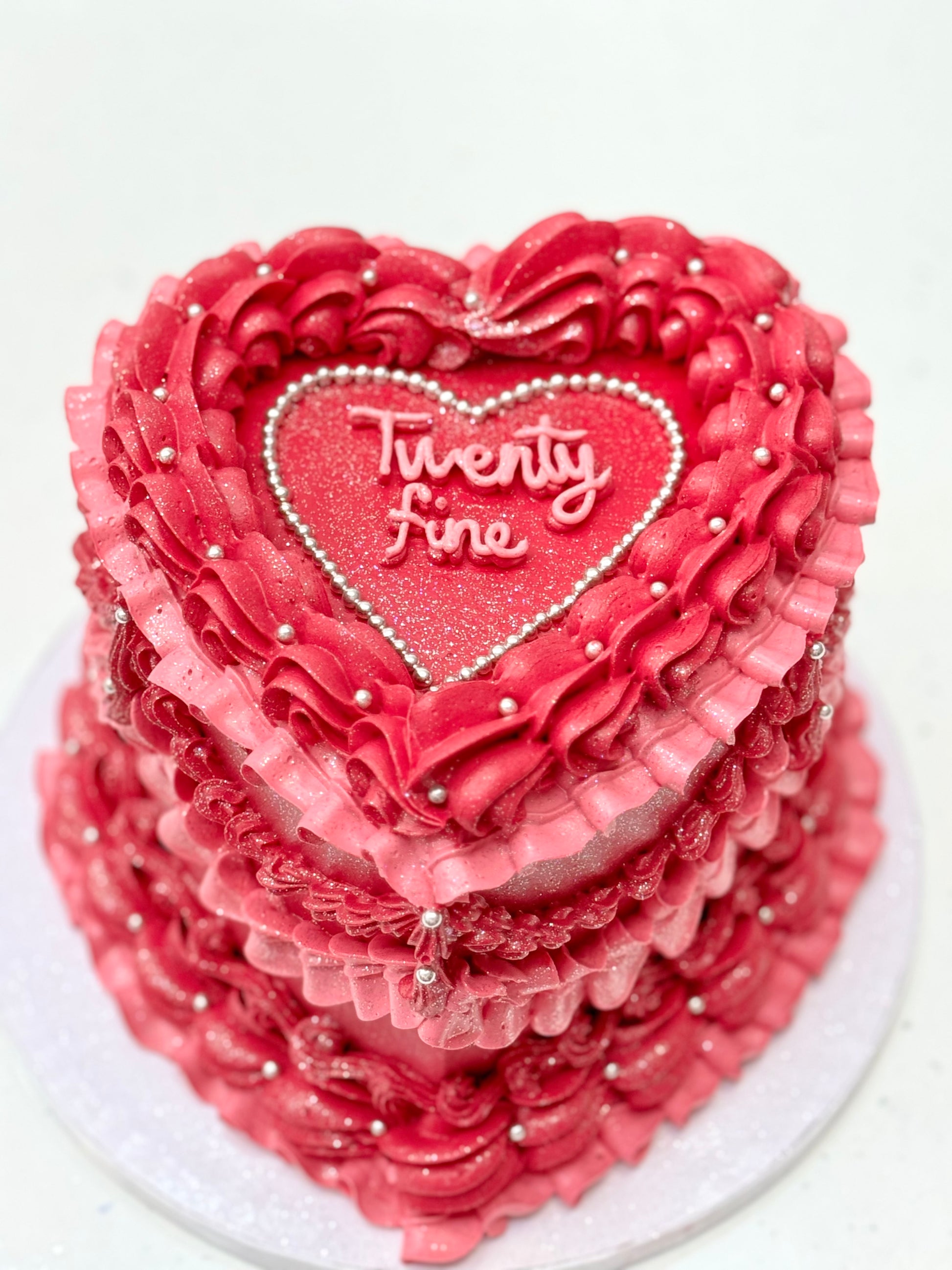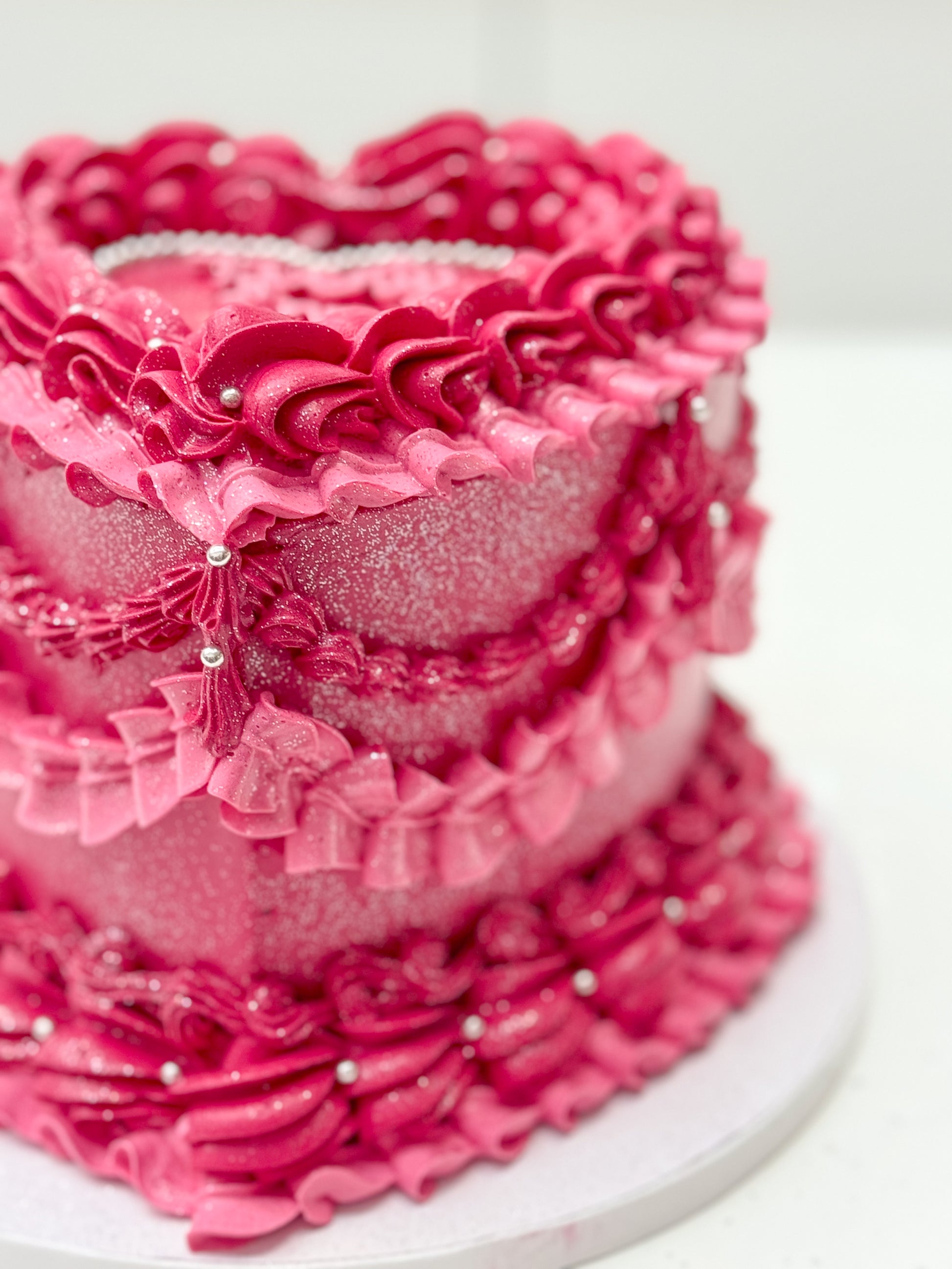 Pastel en tonos fucsia fuerte y fucsia claro, con perlas plateadas y un poco de brillo plateado, encima con un corazón en perlas y dentro una frase muy corta, su perfección en cada detalle lo hace único.